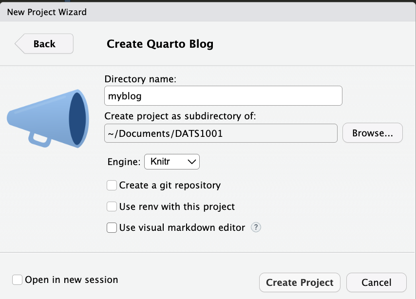 To create a new blog project within RStudio, use the New Project command and select Quarto Blog: