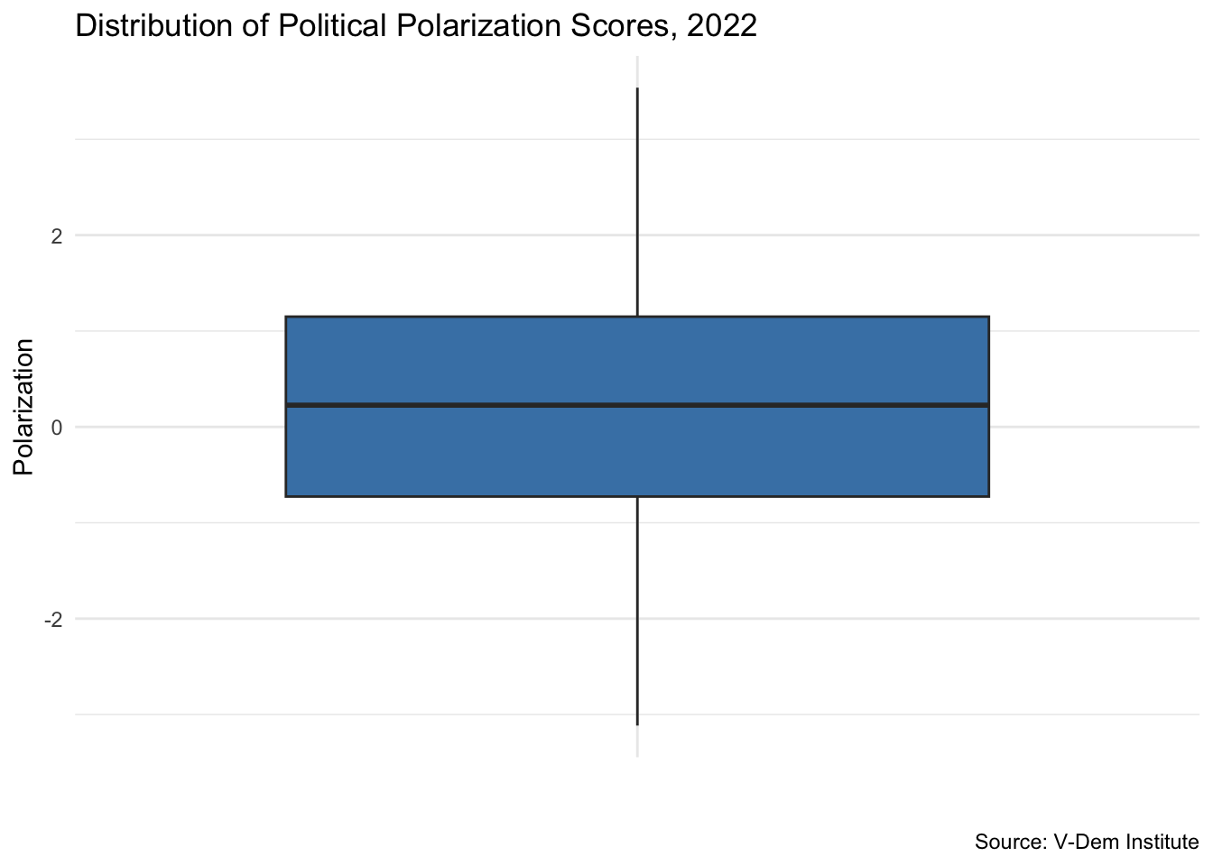 ggplot(vdem2022, aes(x ="", y =polarization))+geom_boxplot(fill ="steelblue")+labs( x ="", y ="Polarization", title ="Distribution of Political Polarization Scores, 2022", caption ="Source: V-Dem Institute")+theme_minimal()