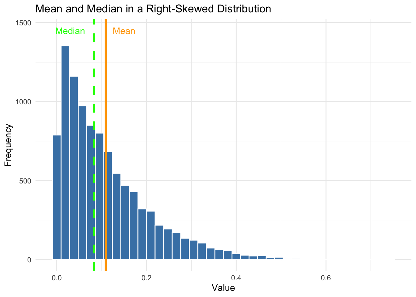 In the right-skewed case, we can see that the mean is pulled to the right by a few large values, while the median stays closer to the bulk of the data. This is why the median can sometimes offer a more realistic picture of central tendency, especially when distributions are skewed.