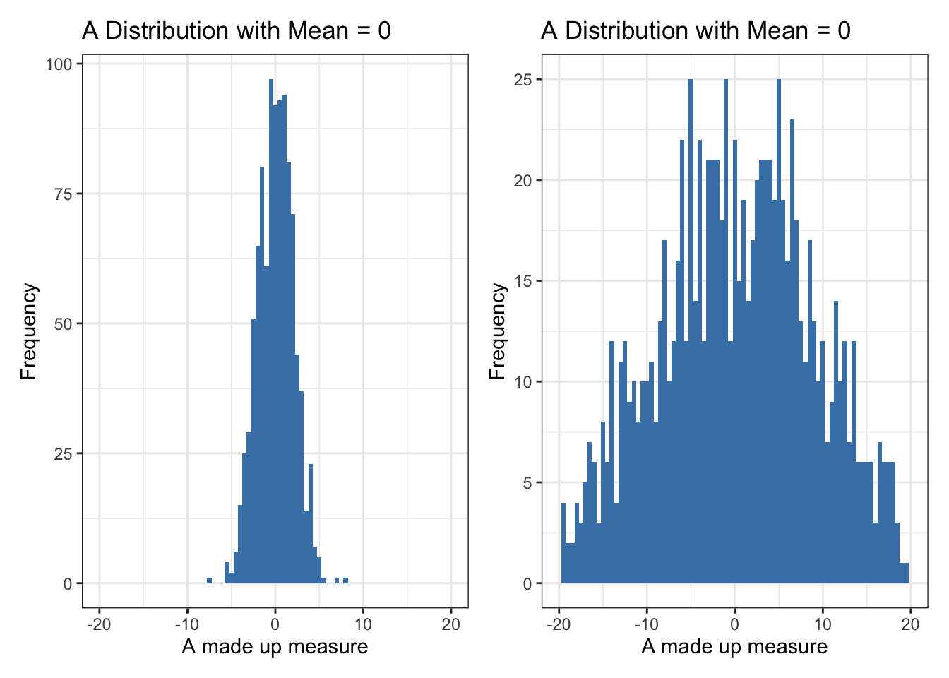 Why should we be concerned with spread? Let’s start by comparing two distributions. Both have the same mean — zero — but one has values tightly clustered around that mean, while the other spreads out much more broadly.