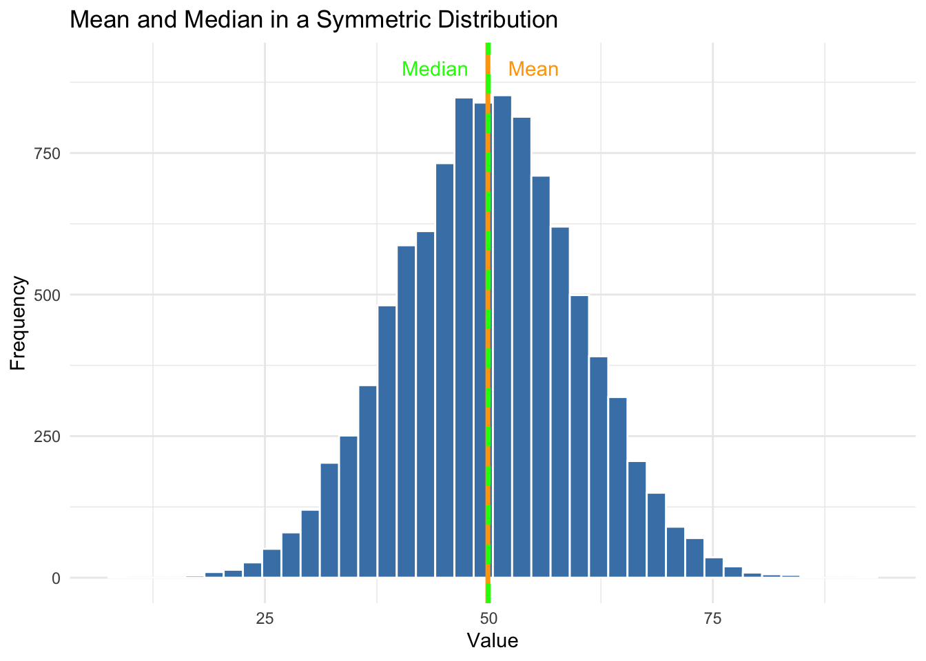In a symmetric distribution, the mean and median are nearly identical. In this example, both are around 50. This is why the mean is often a reliable summary when data are normally distributed.