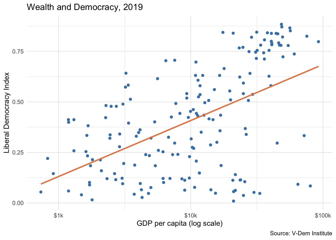 ggplot(model_data, aes(x =wealth, y =lib_dem))+geom_point(color ="steelblue")+geom_smooth(method ="lm", color ="#E48957", se =FALSE)+scale_x_log10(labels =scales::label_dollar(suffix ="k"))+labs( title ="Wealth and Democracy, 2019", x ="GDP per capita (log scale)", y ="Liberal Democracy Index", caption ="Source: V-Dem Institute")+theme_minimal()