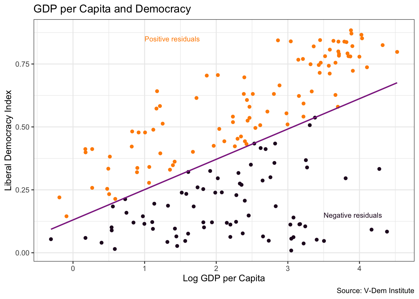 Countries above the line have positive residuals (higher democracy than predicted by wealth alone), while countries below the line have negative residuals (lower democracy than predicted).