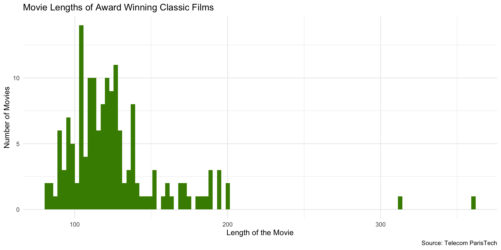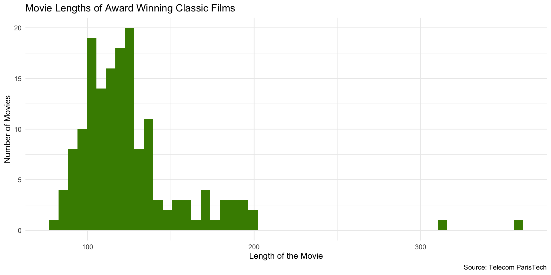 ggplot(films_w_awards, aes(x = Length)) +geom_histogram(binwidth =20, fill ="chartreuse4") +labs(x ="Length of the Movie",y ="Number of Movies",title ="Movie Lengths of Award Winning Classic Films",caption ="Source: Telecom ParisTech" ) +theme_minimal()