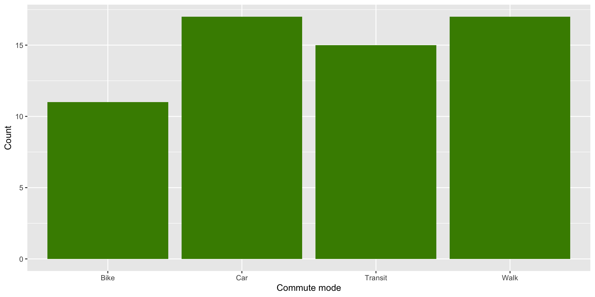 ggplot(lifelog, aes(x = commute_mode)) +geom_bar(fill="chartreuse4") +labs(x ="Commute mode", y ="Count")