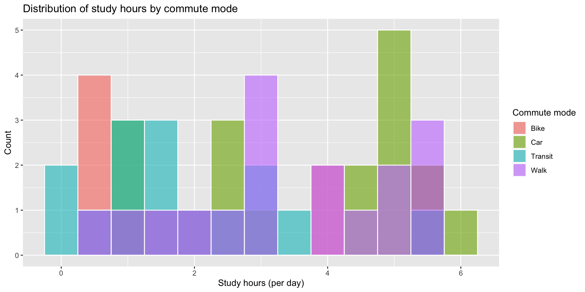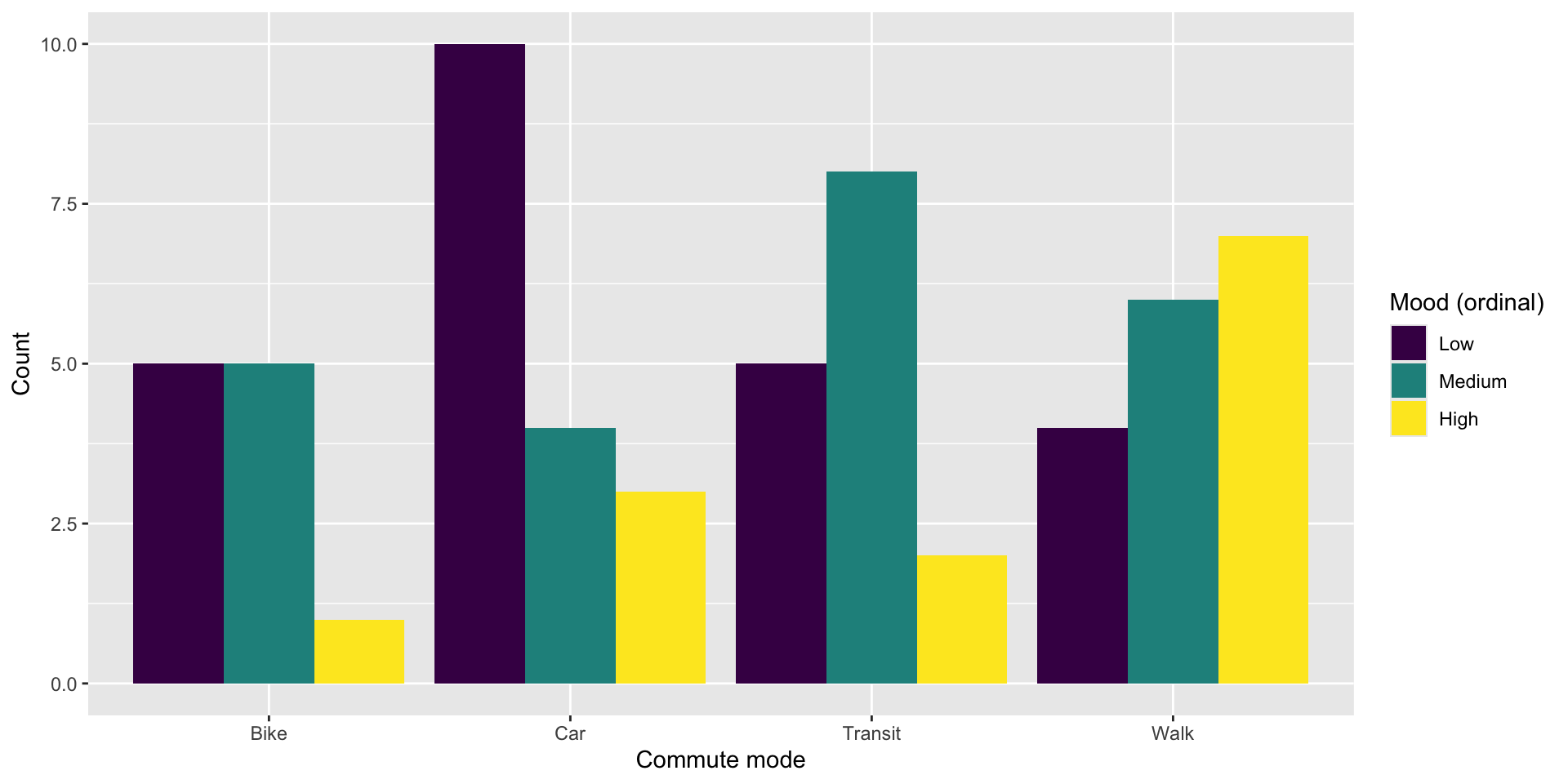 ggplot(lifelog, aes(x = commute_mode, fill = mood)) +geom_bar(position ="dodge") +labs(x ="Commute mode", y ="Count", fill ="Mood (ordinal)")