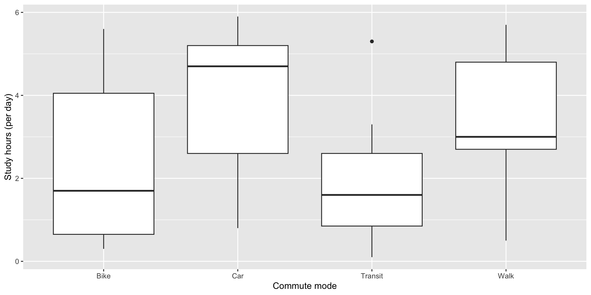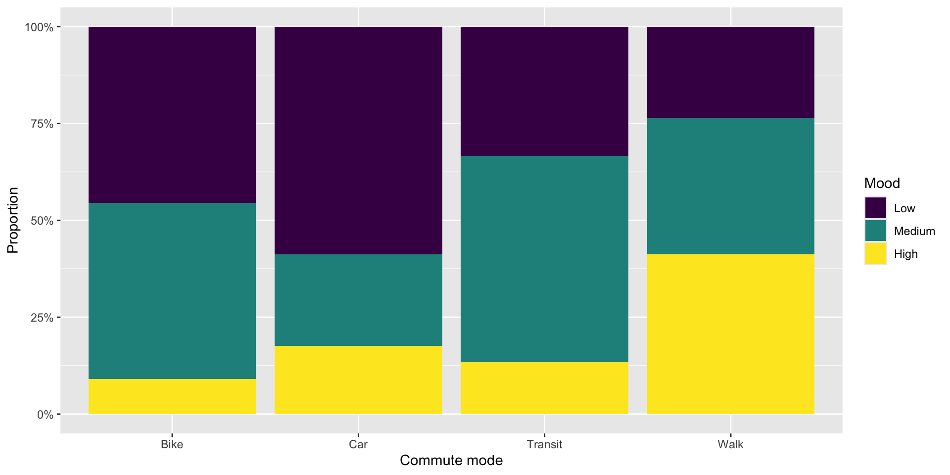 ggplot(lifelog, aes(x = commute_mode, fill = mood)) +geom_bar(position ="fill") +scale_y_continuous(labels = scales::percent) +labs(x ="Commute mode", y ="Proportion", fill ="Mood")