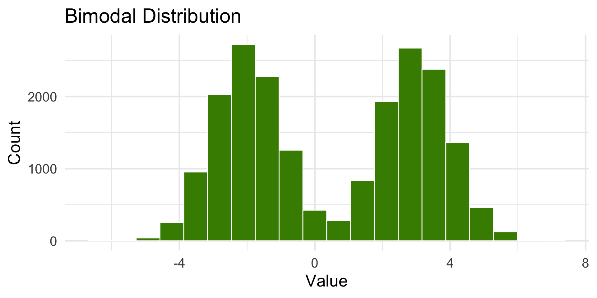 annotate("text", x = stats$median_x - 0.4,y = 1500, label = "Median", color = "blue") + theme_minimal(base_size = 16)Data like this might be the combination of two groups. Taking the mean is not meaningful until the groups are separated.