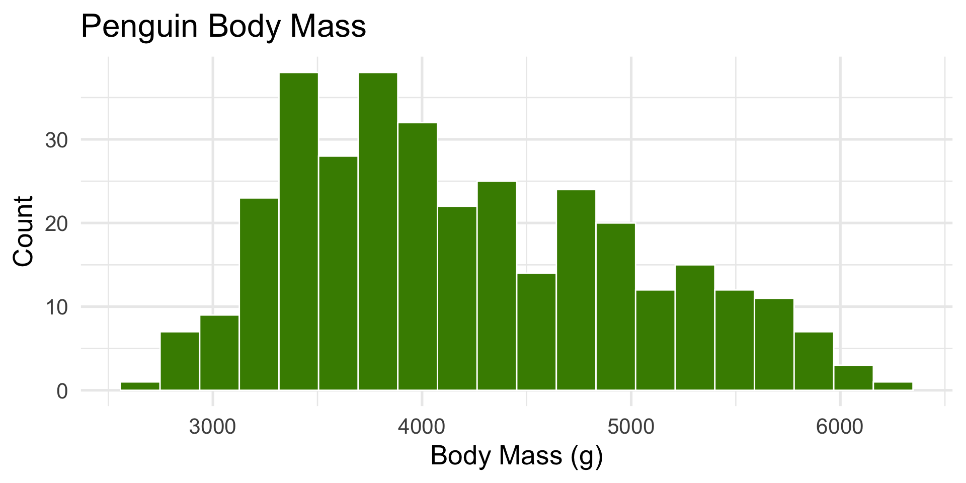 labs(title = "Penguin Body Mass", x = "Body Mass (g)", y = "Count")