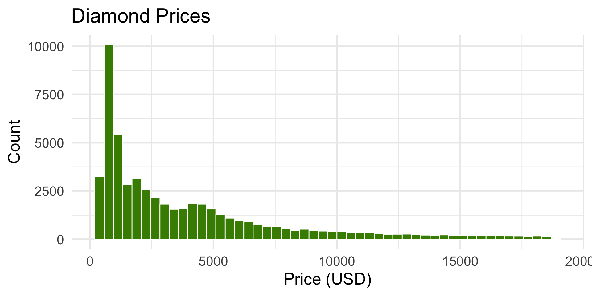 labs(title = "Diamond Prices", x = "Price (USD)", y = "Count")