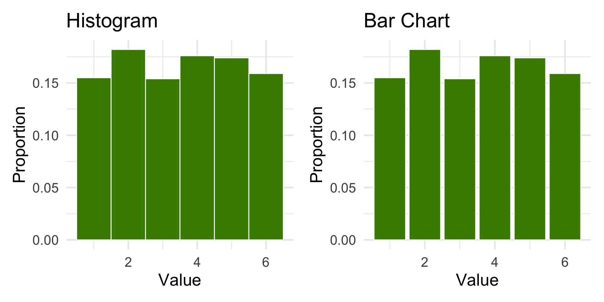 geom_histogram(aes(y = after_stat(count / sum(count))), bins = 6, fill = "chartreuse4", color = "white") +
