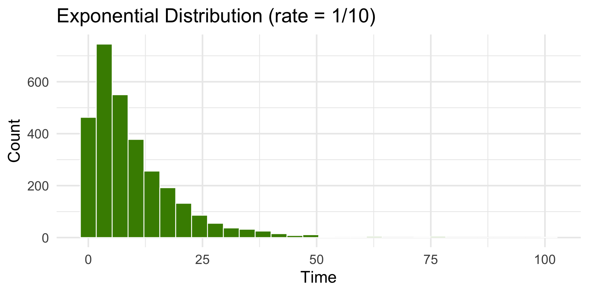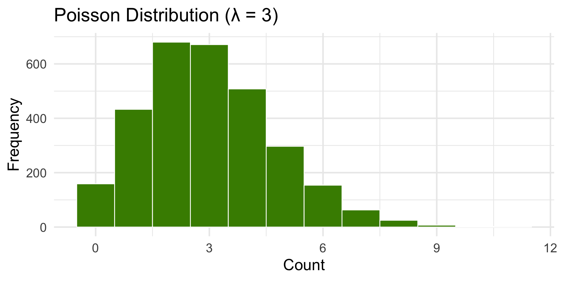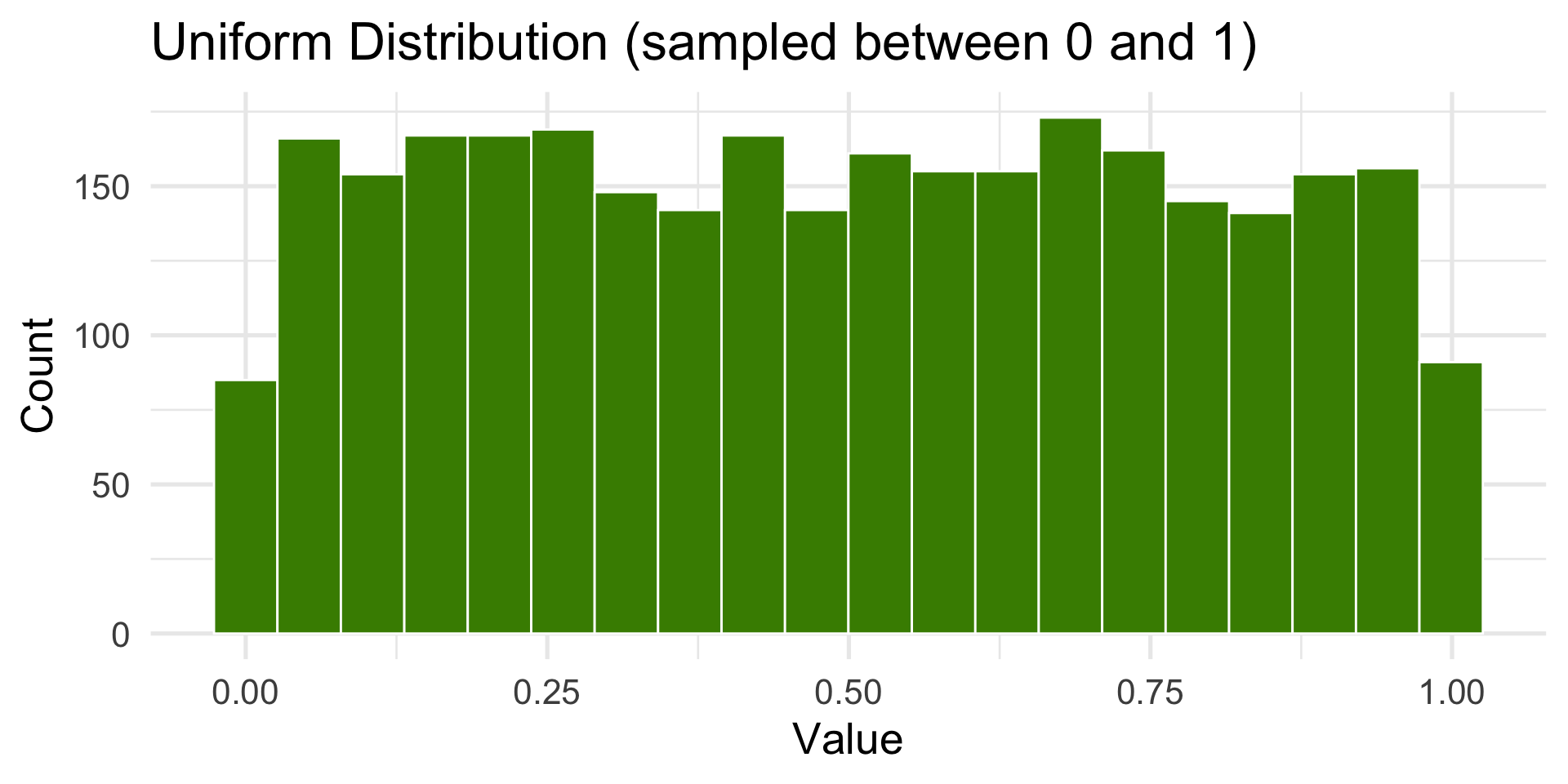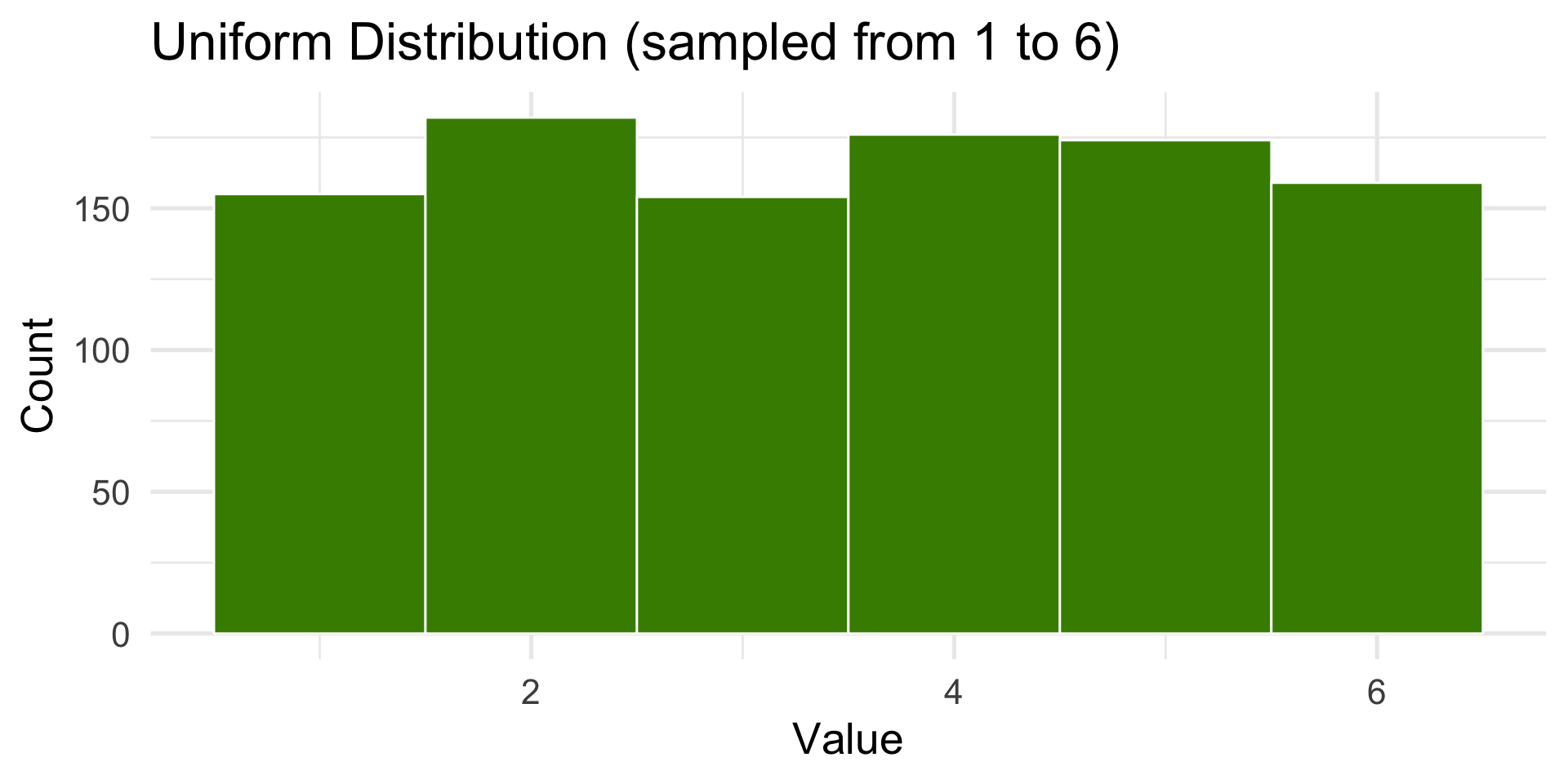 runif() — Uniform distributionrnorm() — Normal (Gaussian) distributionrpois() — Poisson distributionrexp() — Exponential distributionAll outcomes are equally likely.