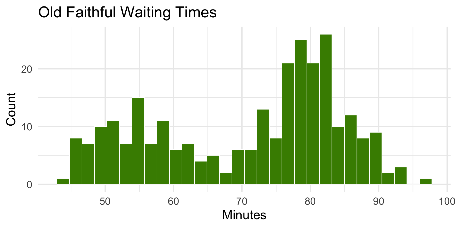 labs(title = "Old Faithful Waiting Times", x = "Minutes", y = "Count")