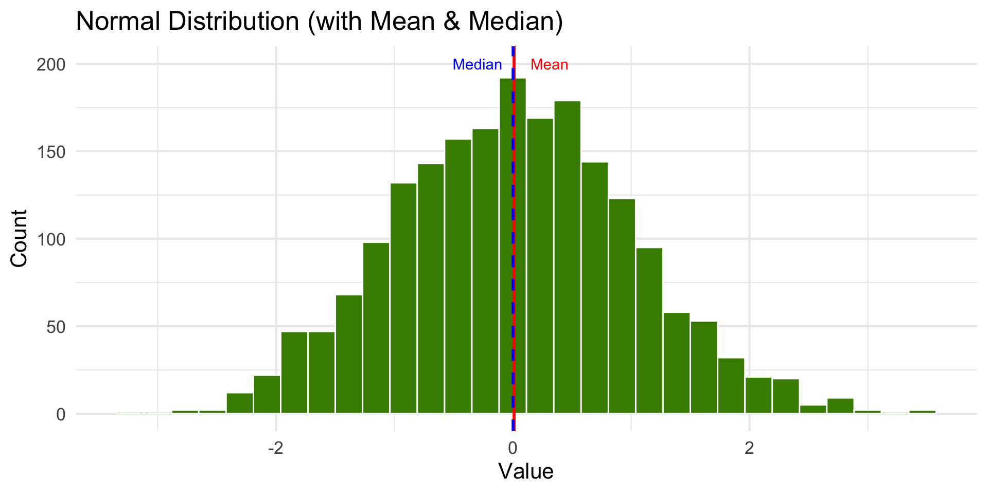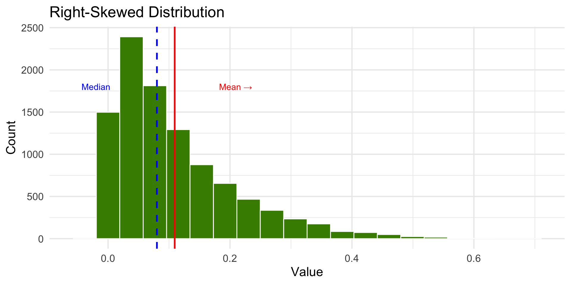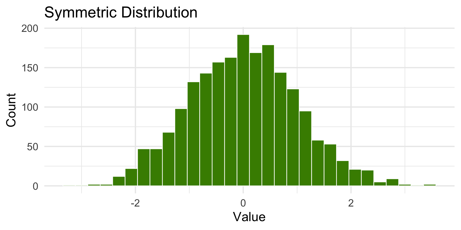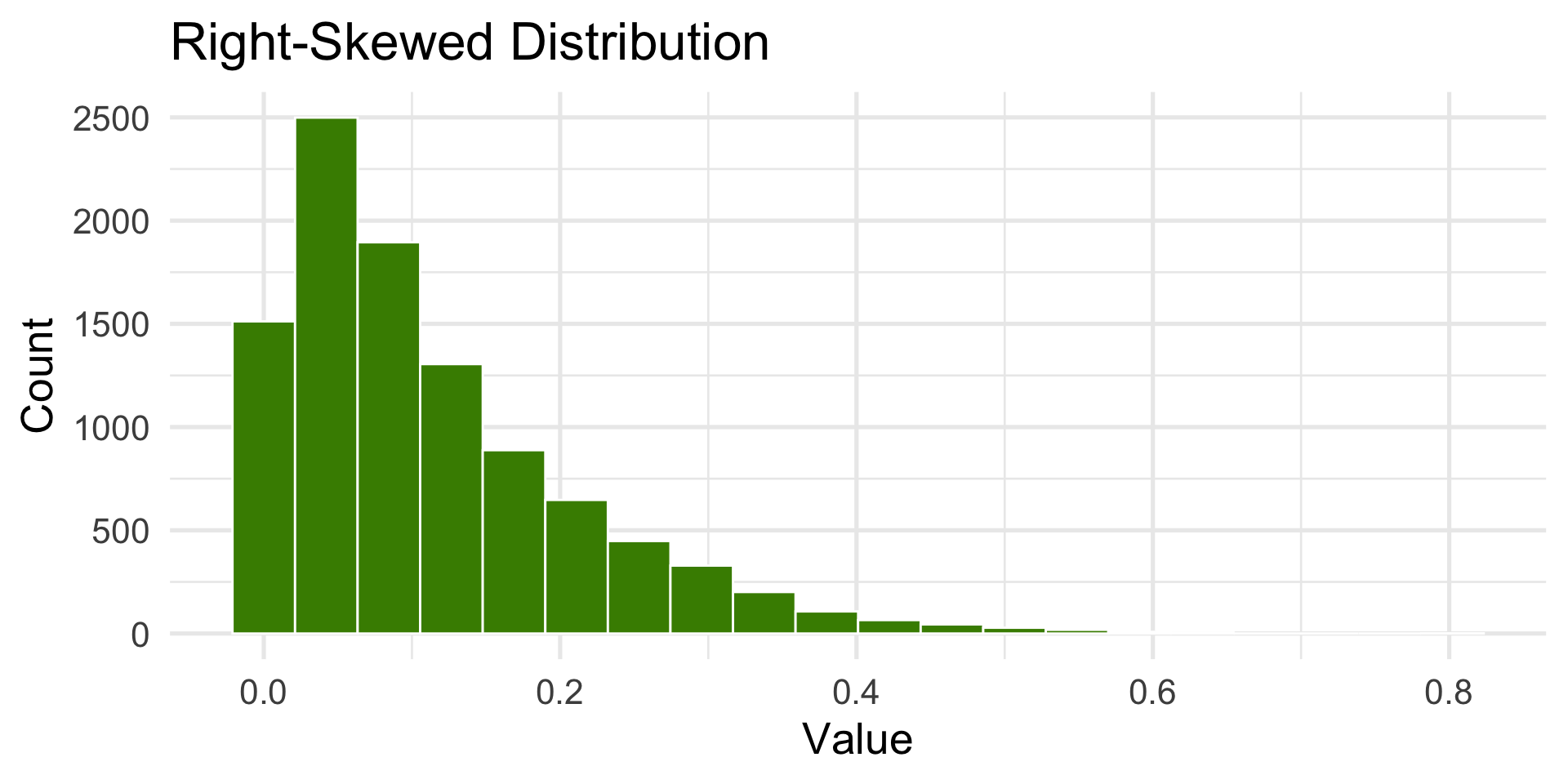 labs(title = "Right-Skewed Distribution", x = "Value", y = "Count") +