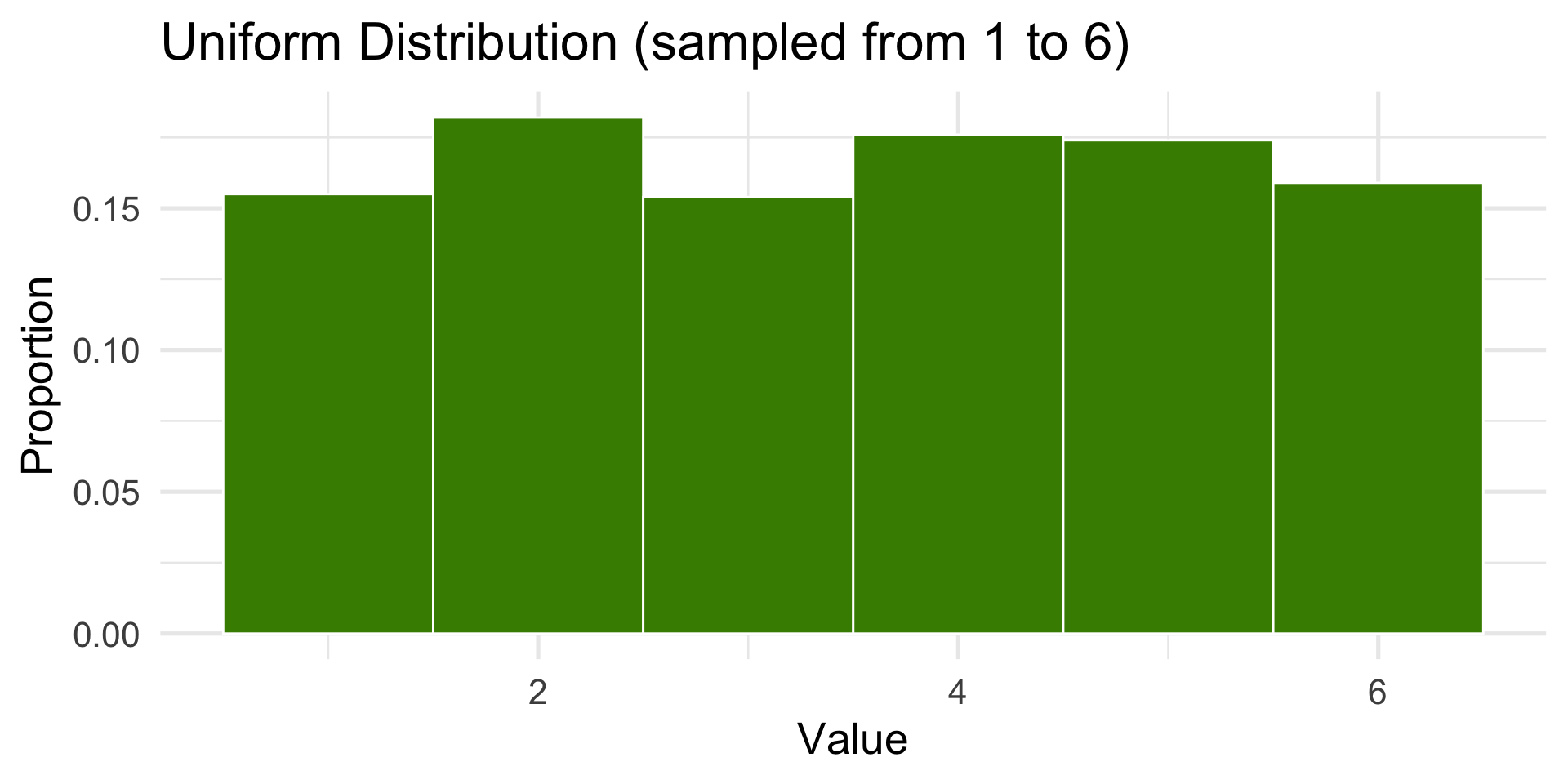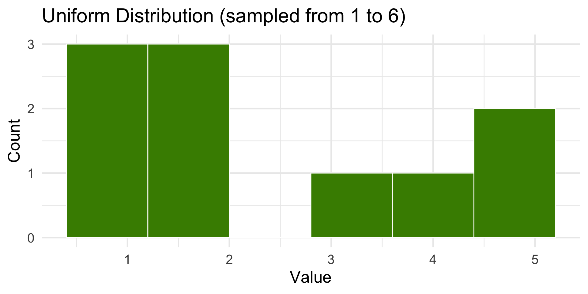 title = "Uniform Distribution (sampled from 1 to 6)",