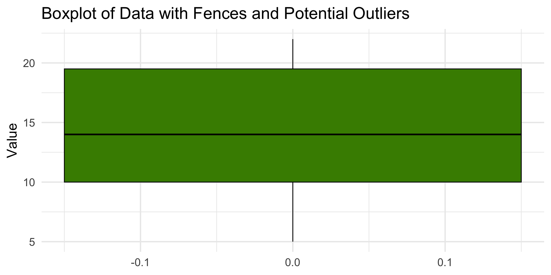 \[\text{Lower Fence} = Q1 - 1.5 \times IQR = 10 - 1.5(9.5) = -4.25\] \[\text{Upper Fence} = Q3 + 1.5 \times IQR = 19.5 + 1.5(9.5) = 33.75\]