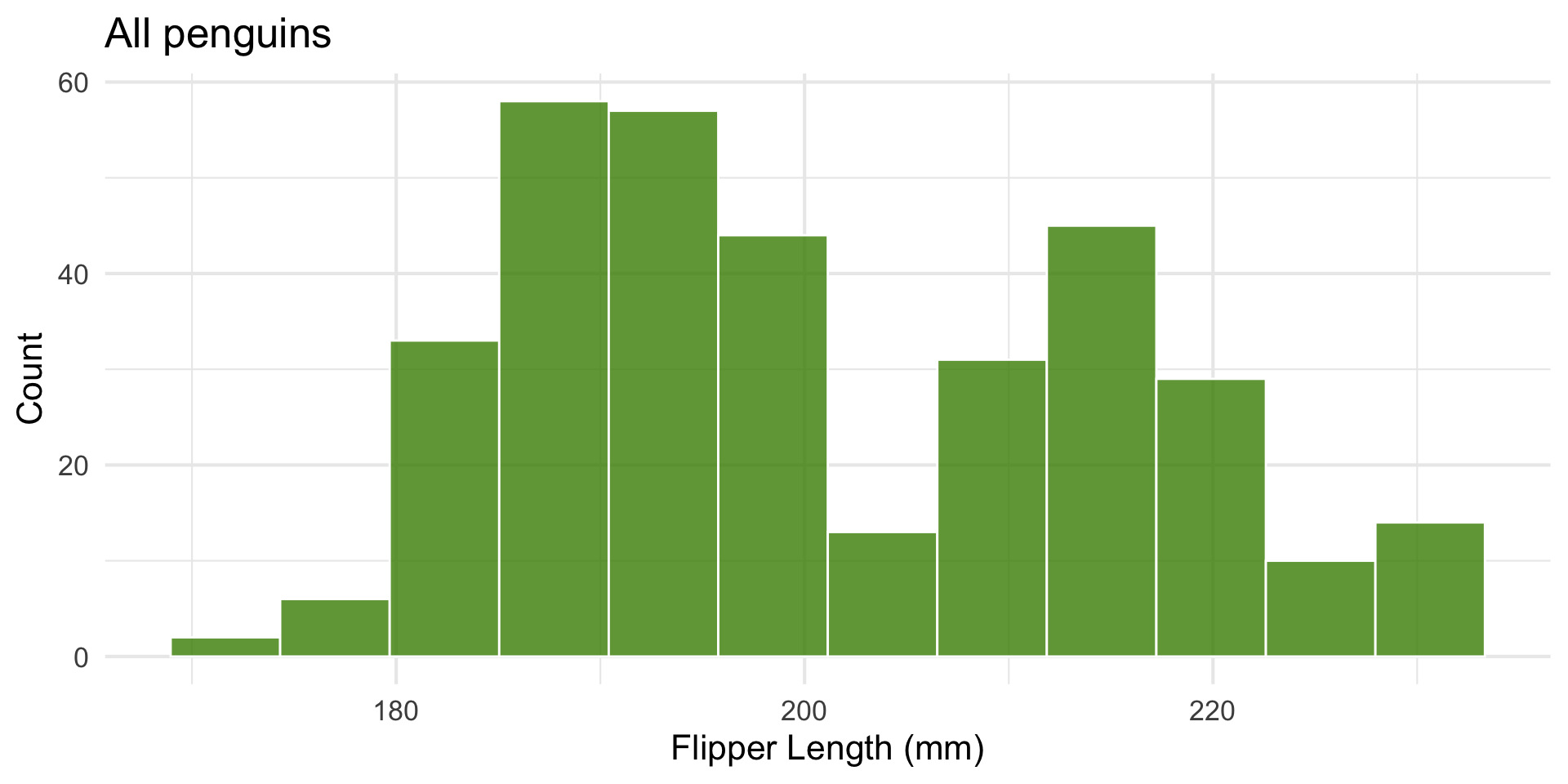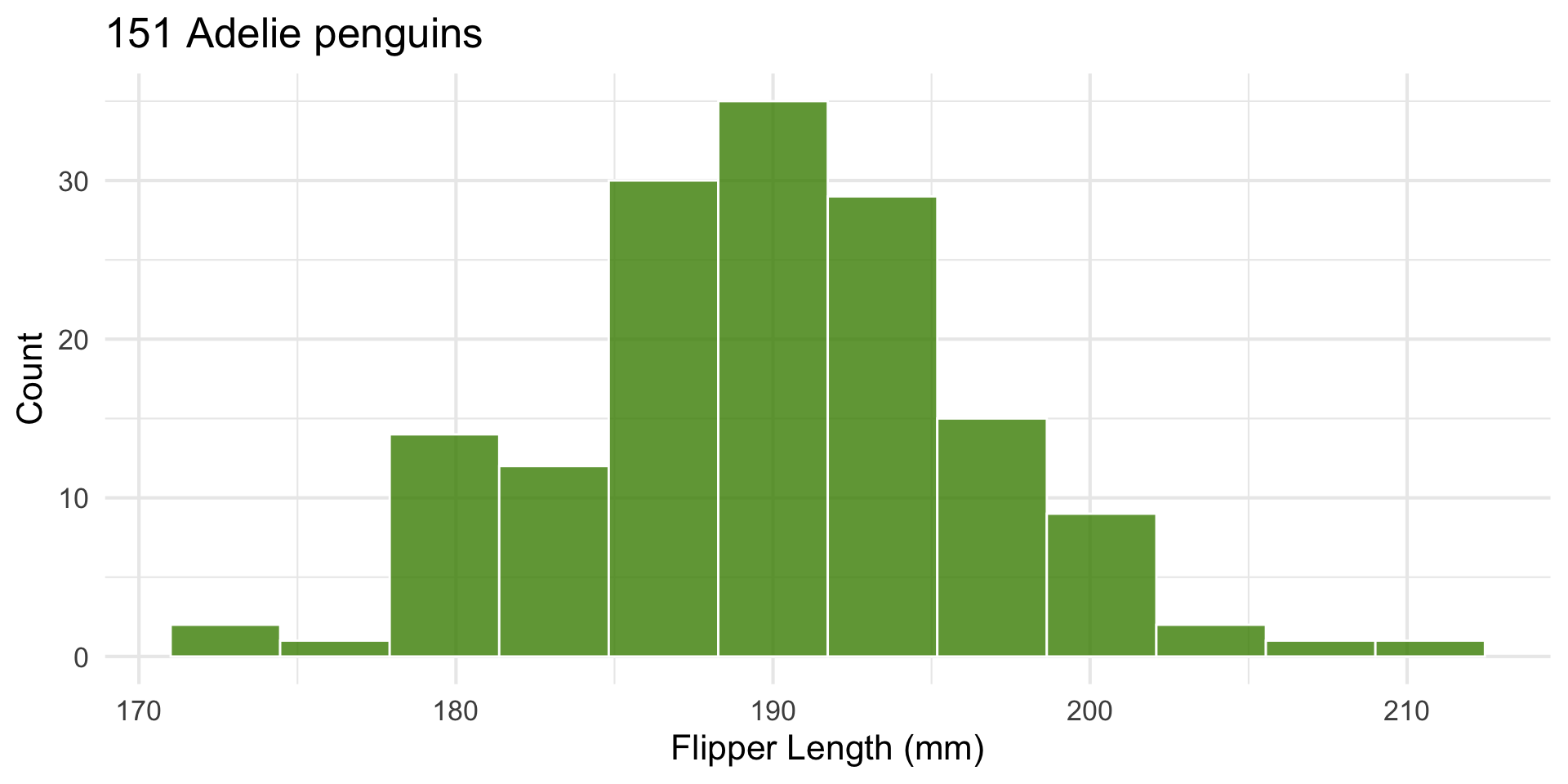 y = "Count") + theme_minimal(base_size = 16)Let’s look at penguin flipper length.