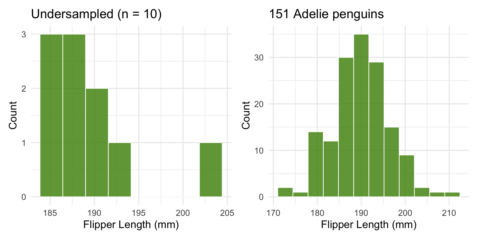 p_small <- ggplot(small_sample, aes(x = flipper_length_mm)) +