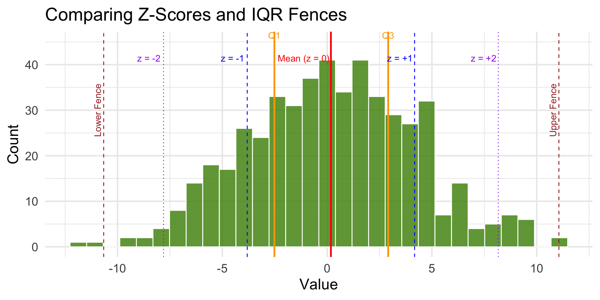 annotate("text", x = upper_fence, y = 30, label = "Upper Fence", color = "brown", angle = 90, vjust = -0.4)| Type | Formula | Purpose | Common Use |