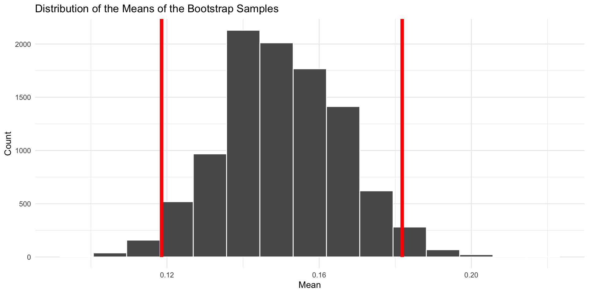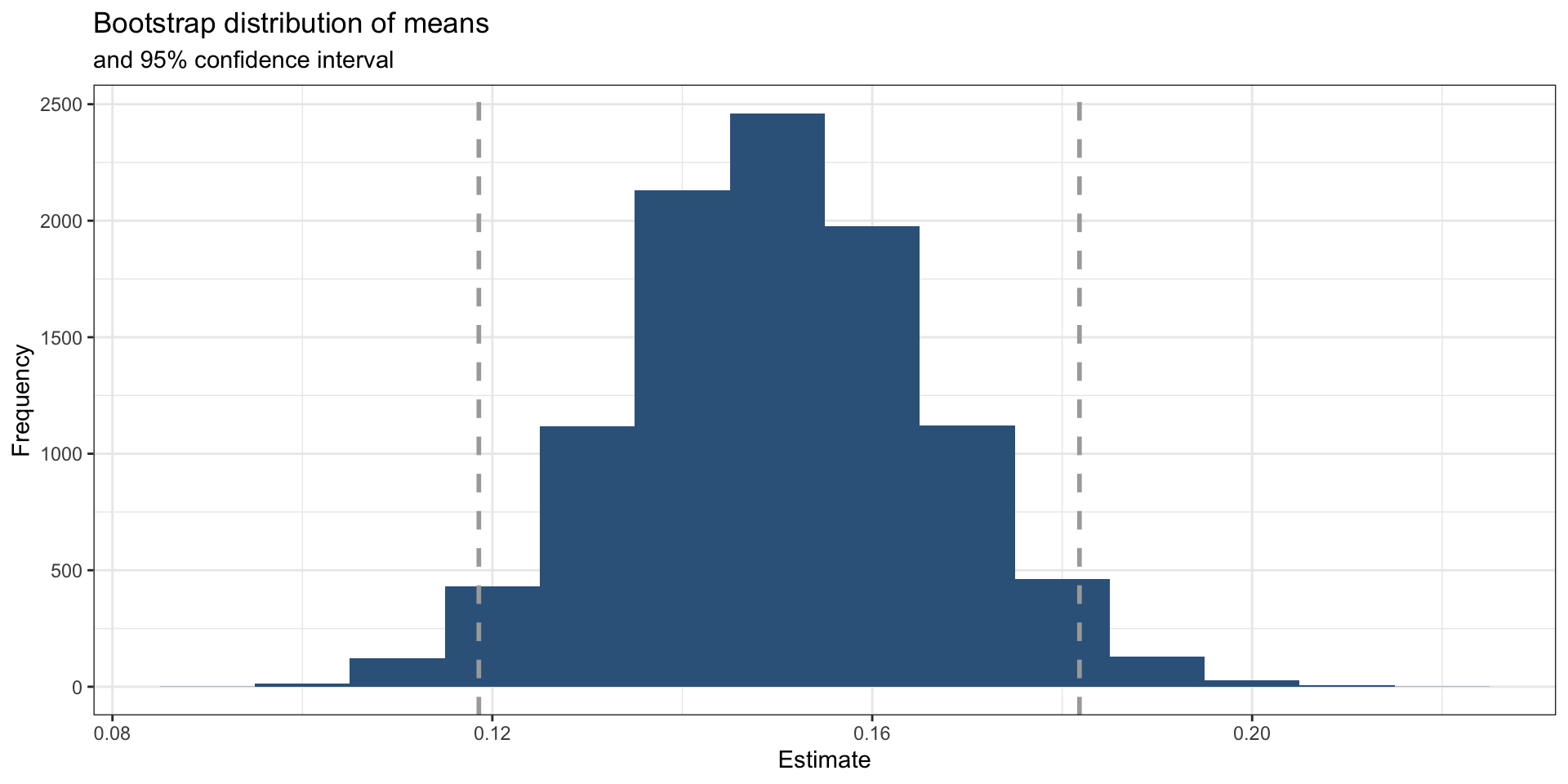 Calculate the confidence interval. A 95% confidence interval is bounded by the middle 95% of the bootstrap distribution.
