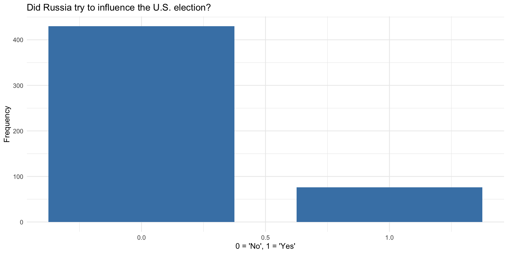 (d) We are 95% confident that the proportion of Russians who supported interfering in the 2016 US elections is between lower_bound and upper_bound.
